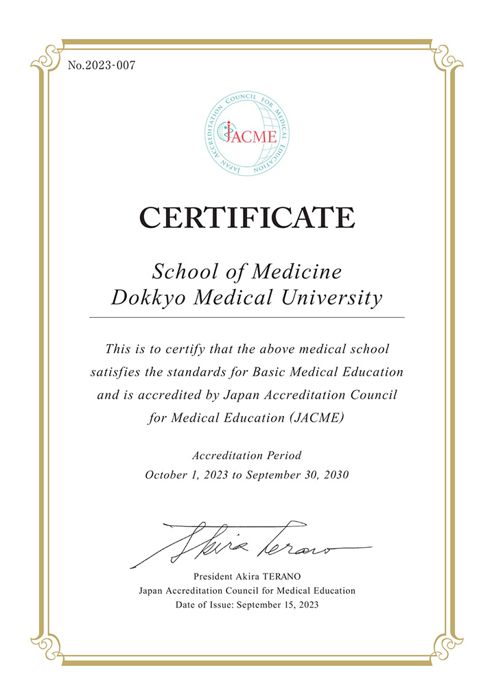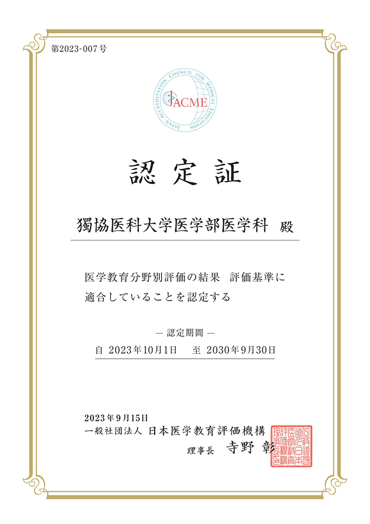 獨協医科大学医学部は、令和4(2022)年度に一般社団法人日本医学教育評価機構(JACME)による医学教育分野別評価を受審しました。