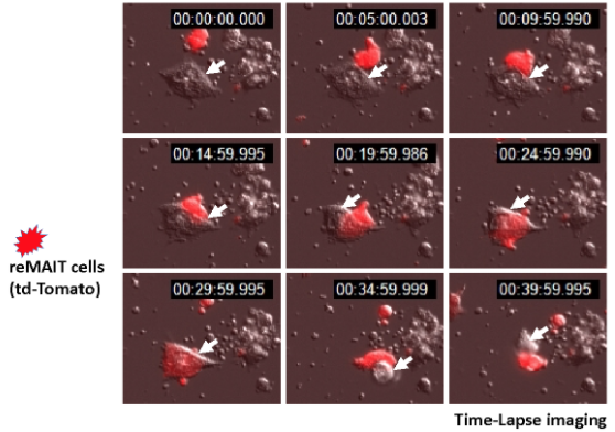 下図はヒトiPS細胞から分化誘導したMAIT細胞(赤色)と細菌感染させた上皮細胞を混合して、タイムラプス顕微鏡像を取得したものです。ヒトiPS細胞から分化誘導したMAIT細胞は赤色の蛍光色素で標識してあります。時間の経過とともに赤い細胞(ヒトiPS細胞から分化誘導したMAIT細胞)が形を変えながら感染細胞(矢印)の上を這う様にして移動し、ついにはこれを破壊するのが観察できます。ただし、この細胞傷害活性ががん細胞に対しても見られるのかは未だはっきりしておりません。